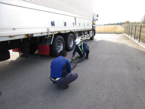 また、講習会終了後、各営業所で実践形式の訓練を実施しました。営業所外部への油漏れ流出を想定した緊急事態対応訓練やトラックのタイヤチェーン装着指導など、今後の降雪に備えた安全対策を実施しました。